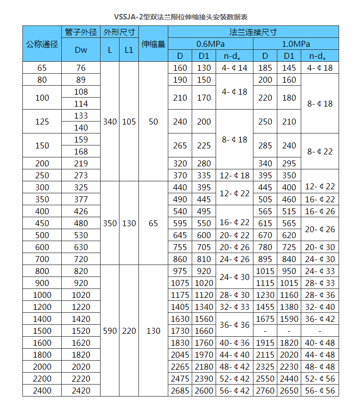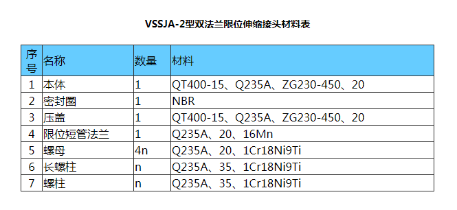 4 材質優良,運行穩定。VSSJA-2型雙法蘭限位伸縮接頭適用于輸送海水、淡水、冷熱水、飲用水、生活污水、原油、燃油、潤滑油、成品油、空氣、煤氣、溫度不高于250度的蒸汽和顆粒粉狀等介質。